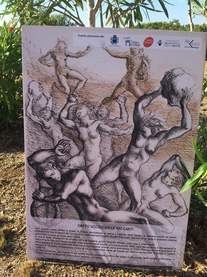 I brani interpretati dallo stesso “Ovidio” hanno ripreso alcuni tratti dell’Ars Amatoria, ma è stato con le ben più famose Metamorfosi che si è avuta una lettura affascinante, mediata grazie a pannelli con litografie del pittore e scultore novecentesco Marcello Tommasi. Sono state infatti alcune delle sconvolgenti metamorfosi ad accogliere i visitatori nel viale d’ingresso: c’erano Apollo e Dafne, nell’abbraccio che la trasforma in alloro, Icaro nella sua rovinosa caduta, e Atteone divorato per l’ira di Diana, Orfeo ucciso dalle baccanti.