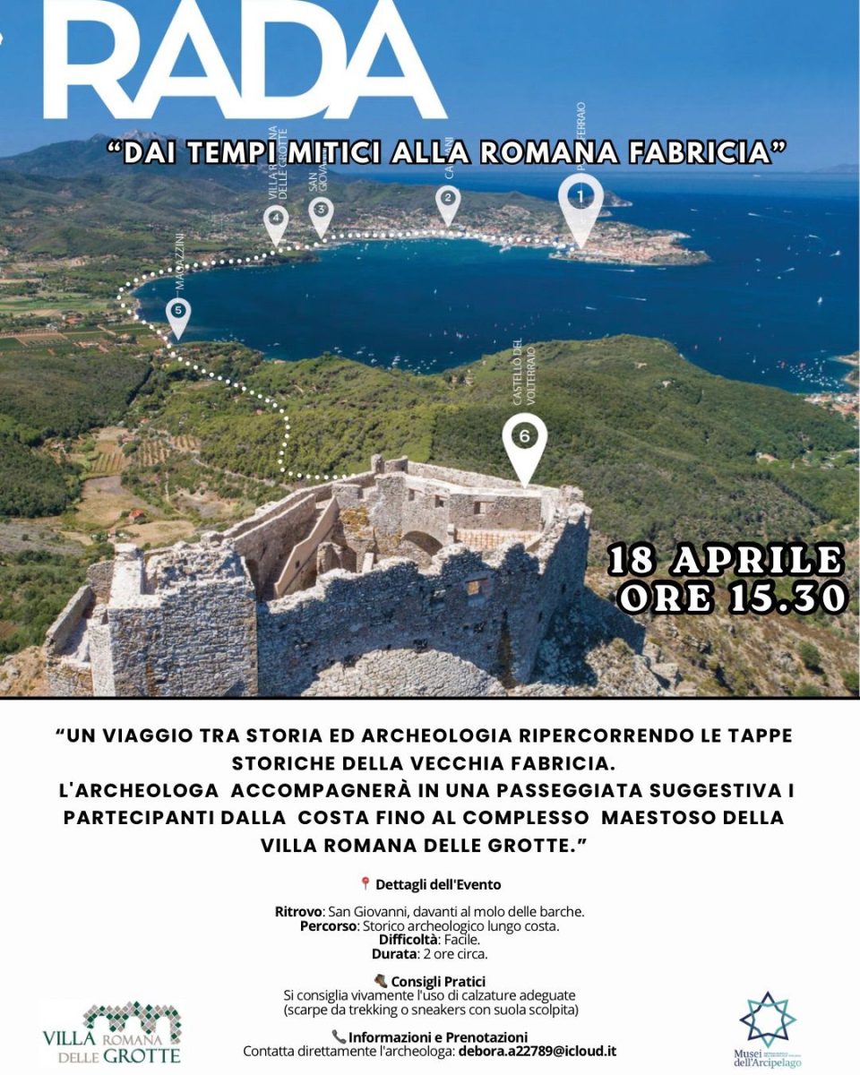 Lungo l’itinerario storico, naturalistico e turistico del Cammino della Rada e lungo le rotte del Mediterraneo Antico, passeggiata lungo costa e nel boschetto di lecci per poi arrivare alla Villa romana accompagnati dall’archeologa. Da allora, nonostante i danni arrecati dal tempo e soprattutto dall’uomo, i resti del complesso delle Grotte si ergono ancora maestosi sulla rada di Portoferraio e si offrono ai visitatori per raccontare la loro storia millenaria.